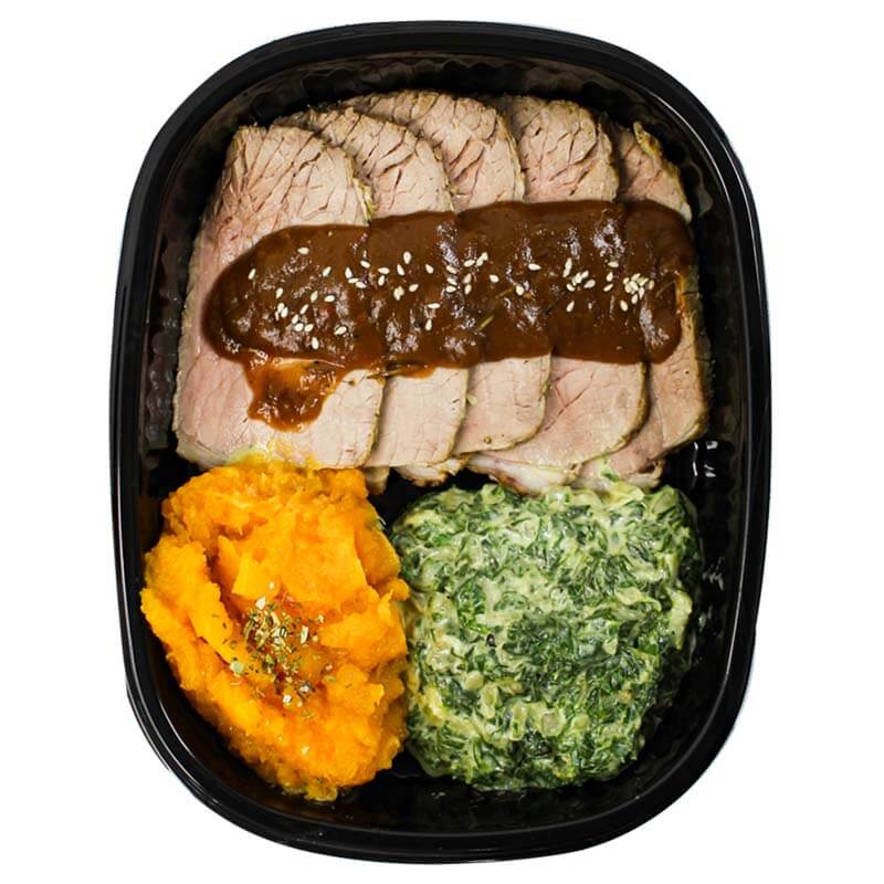 Slowly roasted beef slices, pared with creamed spinach and a butternut mash.