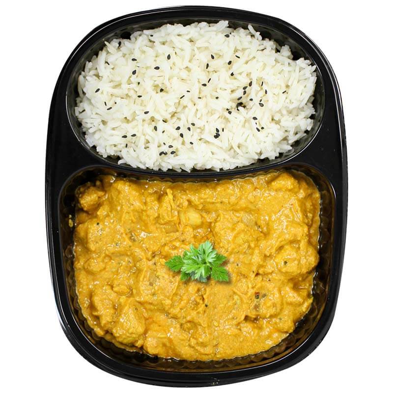 Delicious Indian Style Butter Chicken curry with a hint of heat served with sweet basmati rice.